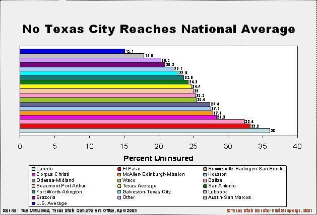 Here’s an amazing fact—not one Texas city reaches the national average in people with health insurance. Not a single one—not Dallas, Houston or even Austin. Why is that?