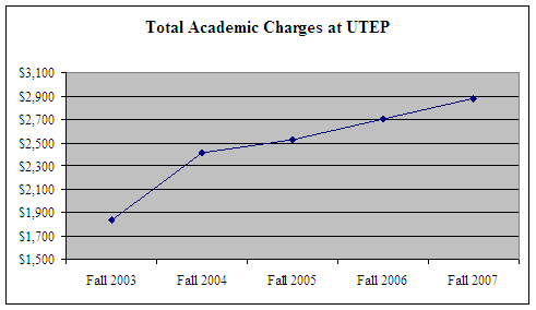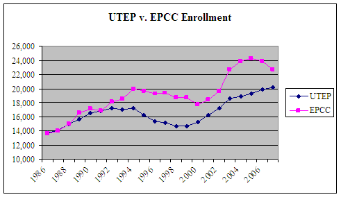 As a result of these increased costs students at UTEP have voted with their feet. In 1988, UTEP and the El Paso Community College (EPCC) had similar enrollments. Today, EPCC has 22,645 students - 12 percent more than UTEP. EPCC's tuition is also 70 percent lower than UTEP's. Many students who have contacted us have cited UTEP's 56 percent increase in tuition as the reason to leave for EPCC.