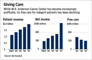M.D. Anderson, which is part of the University of Texas, is a nonprofit institution exempt from taxes. In 2007, it recorded net income of $310 million, bringing its cash, investments and endowment to nearly $1.9 billion.