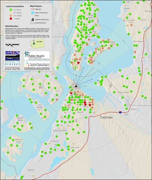For years, an El Paso-based fertilizer company, Ionate, sold a fertilizer that was used on the lawns all across our community. This fertilizer was laden with lead, arsenic, and other hazardous heavy metals. The now out-of-business company used slag from the Oglebay Norton slag-crushing company in west El Paso as part of the fertilizer. Oglebay Norton obtained the slag, a byproduct of the smelting process, from ASARCO. The fact is the EPA's initial survey stopped at 3 kilometers and never established the eastern boundary of lead contamination in El Paso. We don’t know the full extent of lead on yards in El Paso, but it is significantly more than what ASARCO reports in the Corpus Christi bankruptcy court. Thus, will ASARCO or any subsequent owners of the ASARCO property be required to clean up all off-site liabilities? Or will the EPA allow ASARCO to pass the buck to the local taxpayers?Our research indicates that Tacoma, Washington was in a similar circumstance. Tacoma was home to an ASARCO copper smelter that contaminated an area demonstrated to cover over 1,000 square miles. The map on the following page shows the extent of contamination in the northwest Washington area.