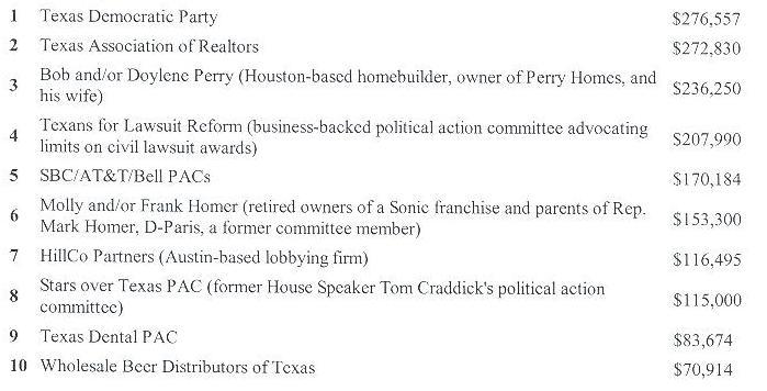 Members of the House committee have collected at least $13 million in contributions from 2000 through July 30, 2008. Top contributors to those members, based on reports to the Texas Ethics Commission, include: