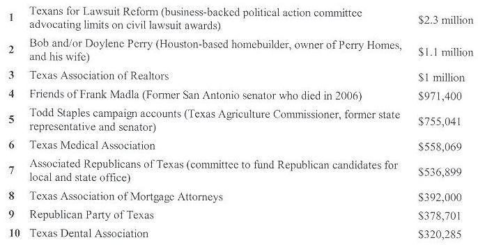 Members of the Senate committee have collected more than $46.8 million in contributions from 2000 through July 30, 2008. Top contributors to those members, based on reports to the Texas Ethics Commission, include: