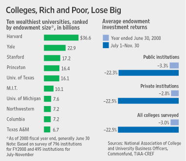 The losses, covering the period between July 1 and Nov. 30 of last year, likely understate the severity of the hit schools have taken, since they don't include losses in illiquid, hard-to-value investments that many schools have loaded up on. Schools warned that the declines could lead to cutbacks in financial aid.