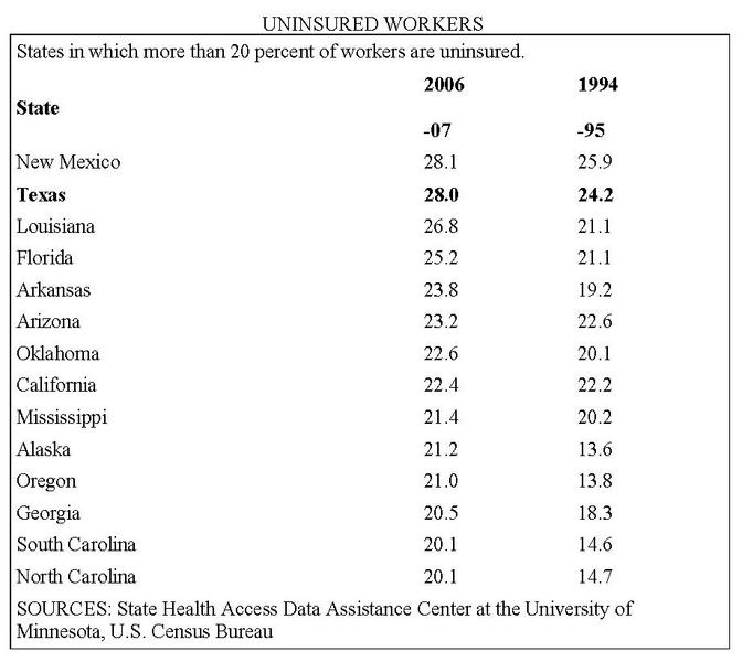 In the 1990s, there were eight states with 20 percent or more of the working age population uninsured. Now there are 14. Texas was on both lists.