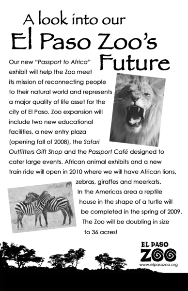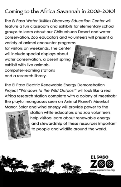 At the El Paso Zoo, visitors can check out the Mexican wolf exhibit, one of nearly two dozen endangered species the Zoo is helping through its conservation education programs. In 2010 the Zoo will open the new "Wild Outpost," an expansion to the zoo's Africa exhibit being sponsored by the El Paso Electric Company. One of the attraction's main goals will be teach young people about the importance of solar and wind energy. Each year, the zoo reaches out to 300,000 people, connecting them to adventures in the Franklin Mountains State Park, Rio Bosque Wetlands Park and others. The Zoo Adventure program at the zoo's El Paso Water Utilities Discovery Center offers K-3 classes on the outdoors by certified teachers.