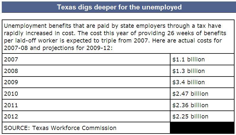 Pauken's projections came nearly three months after Gov. Rick Perry, with the backing of many business groups, rejected $556 million in federal stimulus money for unemployed Texans. He said President Barack Obama and the Democratic Congress attached too many strings to the money and that Texas would have had to expand eligibility for benefits.