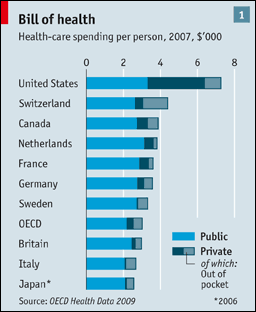 The American health-care system, which gobbles up about 16% of the country’s economic output, is by far the most expensive in the world (see chart 1). The Congressional Budget Office (CBO) estimates that on current trends spending on Medicare and Medicaid, the government schemes for the old and the poor, will rise from 4% of GDP in 2007 to 12% in 2050. The prospect of long-term fiscal disaster is the main reason why efforts to reform health care are gaining momentum in Washington, DC. As Peter Orszag, the director of Barack Obama’s Office of Management and Budget, puts it, “that ‘long term’ keeps getting closer and closer.”