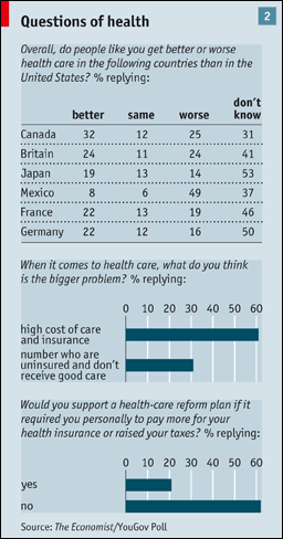 Indeed, tackling inflation in American health care remains the most important and difficult part of the treatment. According to our poll, cost is a tender nerve: 61% thought the high cost of care and insurance was a bigger problem than the number of uninsured, against 31% who believed the reverse. Only 21% would be willing to support a reform plan if they had to pay more in insurance or tax; 62% would not.