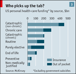 This incentive problem even extends to patients. If patients pay very little out of their own pockets they have little desire to curb consumption. Though this is a problem in many OECD countries, in America the proportion of out-of-pocket spending has declined sharply in the past few decades. And a new report by McKinsey, a firm of management consultants, identifies a more subtle problem. Having examined insurance and out-of-pocket spending for several health risks, it concludes that Americans are generally “over-insured and under-saved”. It is prudent for individuals to have comprehensive health insurance against catastrophic health risks such as heart attacks or cancer. But McKinsey finds that Americans with private health insurance often have generous coverage for non-essential and even medically unjustified care (see chart 3). This encourages over-consumption.