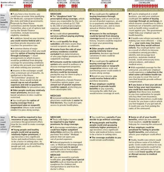 As President Obama and Congress try to overhaul health care, almost every American has a stake. Will you get the care you need? Can you avoid financial ruin? The potential upsides and downsides described below reflect various proposals under consideration. How you fare could depend on the fine print of any legislative compromise - for example, whether you meet the income qualifications for insurance subsidies, and whether those subsidies are enough to allow you to buy insurance. Here's an overview of what you stand to gain or lose: