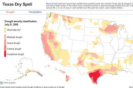 In Texas, rainfall levels started declining in the south and central parts of the state in late 2007. The dry weather has been exacerbated this summer by a spell of unusually high temperatures.