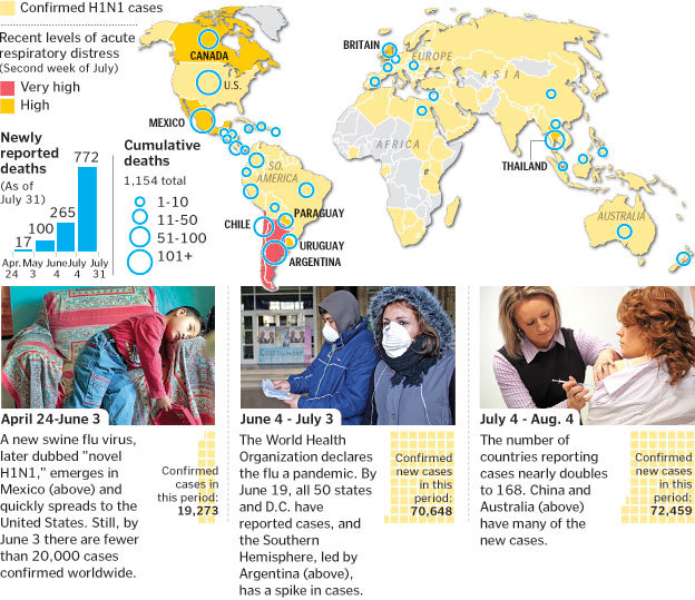Since emerging last spring in Mexico, the virus, known as H1N1, has spread to at least 168 countries, causing more than 162,000 confirmed cases and playing a role in at least 1,154 deaths, including 436 in the United States.