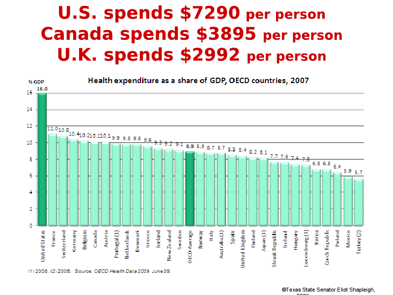 The U.S. spends far more money per capita on health care than any other developed country—16 percent of our Gross Domestic Product versus 10.1 percent for Canada and 8.4 percent for the United Kingdom (U.K.). In 2007, we spent $2.2 trillion on health care or $7,290 per person versus Canada's $3,895 per person and the U.K.'s $2,992 per person. Despite these enormous expenditures, the U.S. ranks far worse on numerous health quality indicators, including life expectancy, infant mortality, and heart disease mortality. Japan, Sweden, France, Germany, Italy, Denmark, Australia, Canada and the U.K. all have better health outcomes. In fact, our infant mortality rate is about that of Croatia and Estonia. Moreover, the U.S. has fewer physicians per capita than most other developed countries. In 2007, the U.S. had 2.43 physicians per 1,000 population while the OECD average was 3.1.
