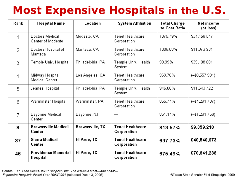 Overcharging and overutilization of services form the bases for some of the highest health care costs in the nation. Sierra Medical Center and Providence Memorial Hospital of El Paso are two of the leading profit centers in the entire U.S.. In fact, the three most expensive hospitals in Texas are Brownsville Medical Center, Sierra Medical Center in El Paso, and Providence Memorial Hospital in El Paso. They were ranked as the #8, #37 and #46 most expensive hospitals in America. All three are owned by Tenet Healthcare Corporation.