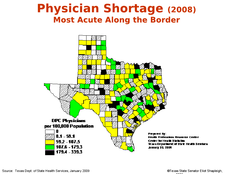 Lower numbers of those with health insurance results in fewer doctors, nurses and other health care professionals available to Texans. While the national average for physicians per 100,000 is 214, Texas has only 159. Massachusetts has 303; New York has 263; Pennsylvania has 237; Florida has 222; Montana has 217; Alaska has 216; Virginia has 215; Michigan has 214; California and Ohio have 210; Illinois has 208; Kentucky has 190; Georgia has 185.