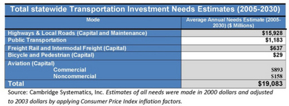 In a report, titled "Moving Texas to the 21st Century," Cambridge Systematics, a leading U.S. consulting group on infrastructure, reported that Texas highway funds are at least $8 billion short each year from meeting the basic needs of a growing state. Chart 1 shows how much Texas needs to spend to build the transportation and infrastructure we need: