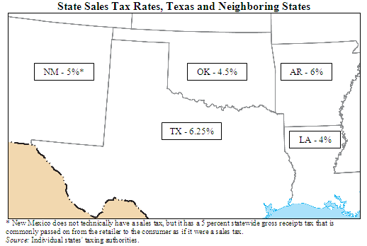 If Texas were to increase the sales tax rate, these costs would be passed along to both Texas consumers and consumers across the country and world, thus putting Texas goods at a severe competitive disadvantage. Further, Texans who live near the state border would have an incentive to travel to the neighboring state to access lower sales tax rates. The map below highlights the state's portion of the sales tax rate for New Mexico, Oklahoma, Arkansas, and Louisiana.