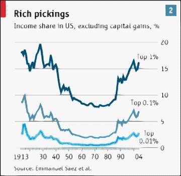 The figures are startling. According to Emmanuel Saez of the University of California, Berkeley, and Thomas Piketty of the Ecole Normale Supérieure in Paris, the share of aggregate income going to the highest-earning 1% of Americans has doubled from 8% in 1980 to over 16% in 2004. That going to the top tenth of 1% has tripled from 2% in 1980 to 7% today. And that going to the top one-hundredth of 1%—the 14,000 taxpayers at the very top of the income ladder—has quadrupled from 0.65% in 1980 to 2.87% in 2004.