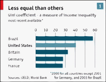 Privately, some policymakers admit that the recent trends have them worried, and not just because of the congressional elections in November. The statistics suggest that the economic boom may fade. Americans still head to the shops with gusto, but it is falling savings rates and rising debts (made possible by high house prices), not real income growth, that keep their wallets open. A bust of some kind could lead to widespread political disaffection. Eventually, the country's social fabric could stretch. “If things carry on like this for long enough,” muses one insider, “we are going to end up like Brazil”—a country notorious for the concentration of its income and wealth.
