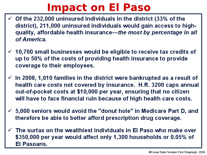 In light of dramatic expansion at Fort Bliss, Mayor John Cook and the Healthcare Council of the Greater El Paso Chamber of Commerce hosted a legislative discussion focused on health care on Monday, November 17, 2008. The purpose of the discussion was to identify health care issues of importance to the community that could be positively impacted through legislative action, whether that be through an appropriation of additional funding or through a change in statute that would improve a policy.